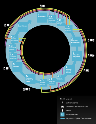 um menschen mit eingeschränkter nierenfunktion vor blutvergiftung zu bewahren, sind dialysen notwendig. das diagramm zeigt den ablauf einer dialysebehandlung und untergliedert den prozess in sieben unterpunkte. bei der erarbeitung eines szenarios diente es für die strukturierung des prozesses und als grundlage für das interface.